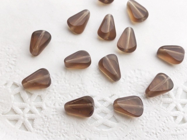 サイズ:縦10mm 横8mm 厚さ4mm 【テーブルカットドロップ】 6個売り ◇◆◇◆◇◆◇◆◇◆◇◆◇◆◇◆◇◆◇ テーブルカットドロップナゲットは、ドロップ型ですが前後が平らではしを不規則にカットしてある個性的な形のビーズです。 横8mm、縦10mm、厚さ4mmで、アクセサリー製作に使いやすい大きさです。 色味はクリアな薄茶色で、ふちはマット加工になっています ※写真をクリックすると大きくなります。 ※粒により色味の濃さや形などに大きな違いがあります。 ※made in Czech ◇◆◇◆◇◆◇◆◇◆◇◆◇◆◇◆◇◆◇ ※チェコビーズの特徴として、粒によりカッティングやコーディングなどに違いがあります。 細かな色味やコーティングの指定は出来ません。 ※ネーミングはカラーやイメージからつけられているものであり、その素材を示す物ではありません。