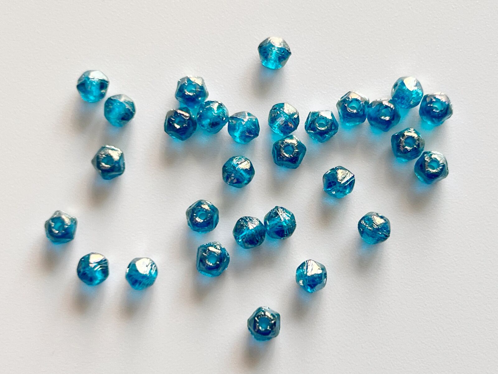 イングリッシュカットとは、ざっくりとした、荒く不規則なカットをしたような面をもつ型に、溶かしたガラスを流し込んで成型された多面カットのビーズです。
